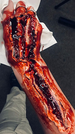 The wound pictured was created by the SpecMed team with liquid latex, toilet paper, and simulated blood. Wound creation with liquid latex is reltively simple, and the created product can be reused many times. The process consists of laying down a base layer of latex, placing torn or crumpled toilet paper in the latex to approximate wound edges and texture, and then adding several layers of latex to seal and add flesh to the wound. Color can then be added with paint once the prosthetic has dried.